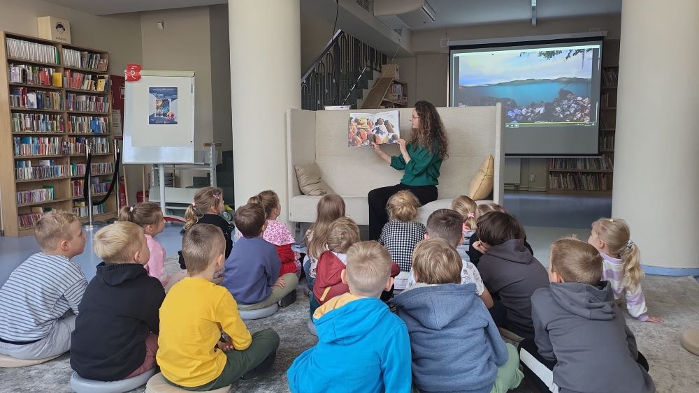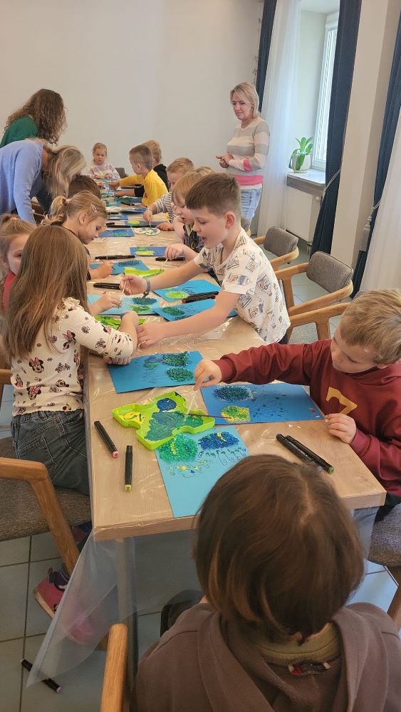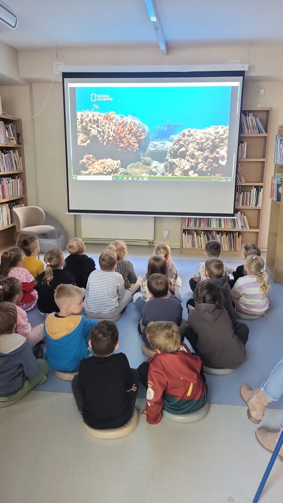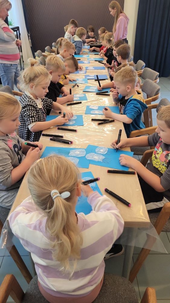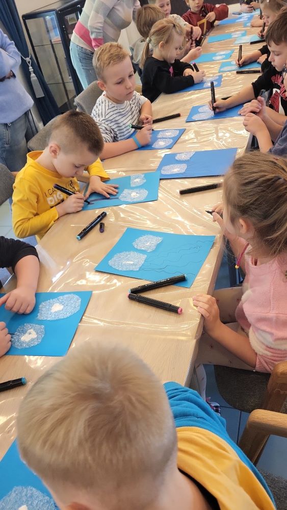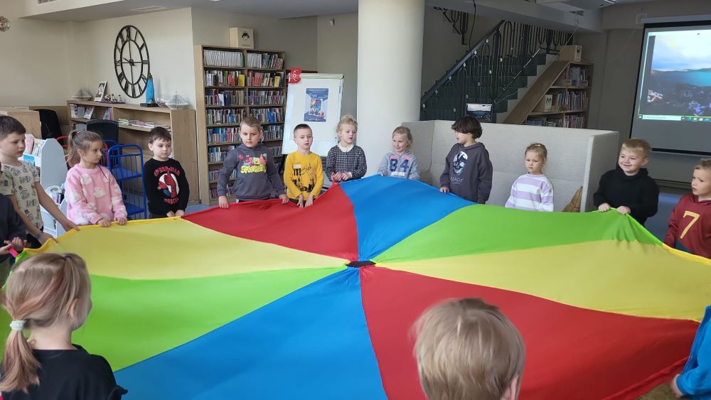 02.10 - Tego dnia wyszliśmy do Biblioteki Publicznej na zajęcia literacko- plastyczne pt. "Ośmiornica na dachu". Dzieci mogły posłuchać bajki i porozmawiać o niej, zobaczyły również film edukacyjny o życiu podwodnym ośmiornicy, bawiły się w zabawy z chustą animacyjną, a na koniec przystąpiły do pracy plastycznej. Po zajęciach odwiedziliśmy plac zabaw na Pl. Hallera.