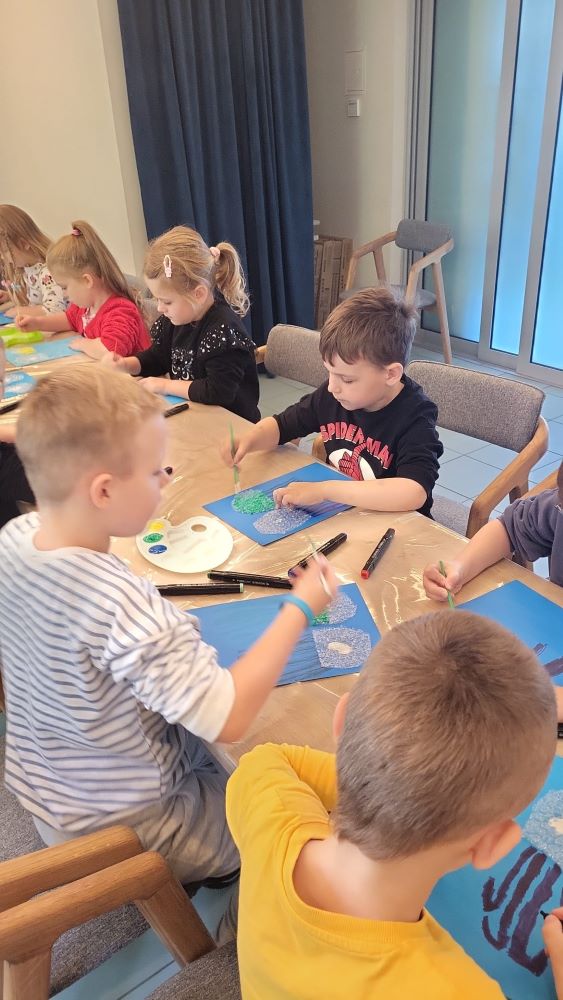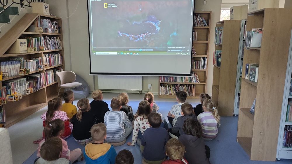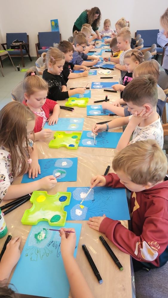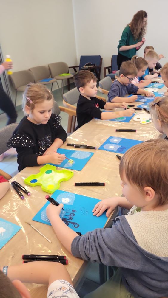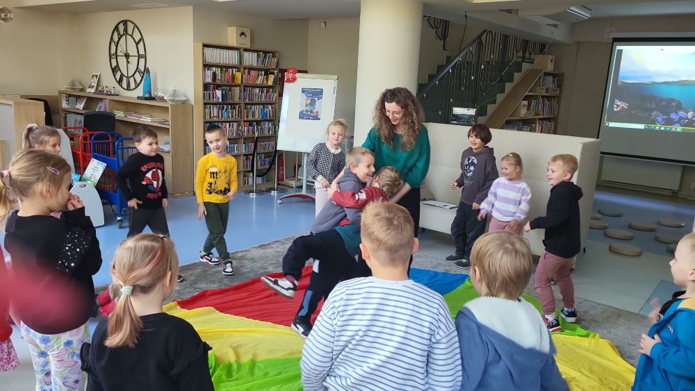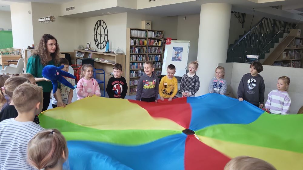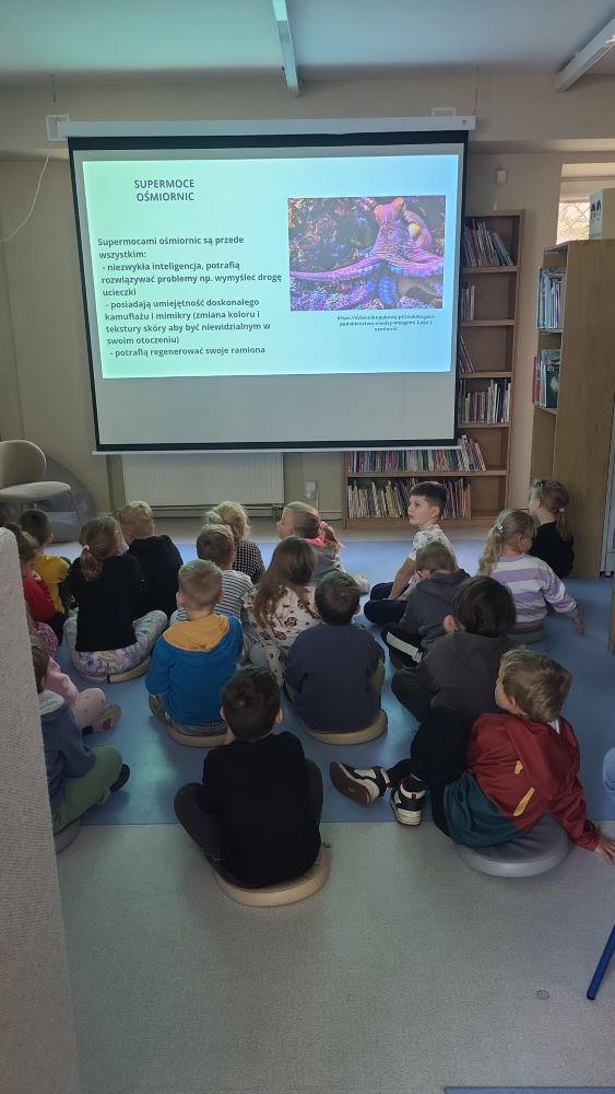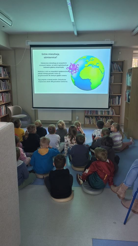 02.10 - Tego dnia wyszliśmy do Biblioteki Publicznej na zajęcia literacko- plastyczne pt. "Ośmiornica na dachu". Dzieci mogły posłuchać bajki i porozmawiać o niej, zobaczyły również film edukacyjny o życiu podwodnym ośmiornicy, bawiły się w zabawy z chustą animacyjną, a na koniec przystąpiły do pracy plastycznej. Po zajęciach odwiedziliśmy plac zabaw na Pl. Hallera.