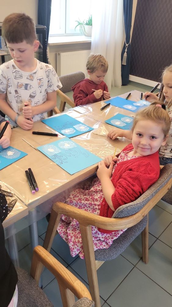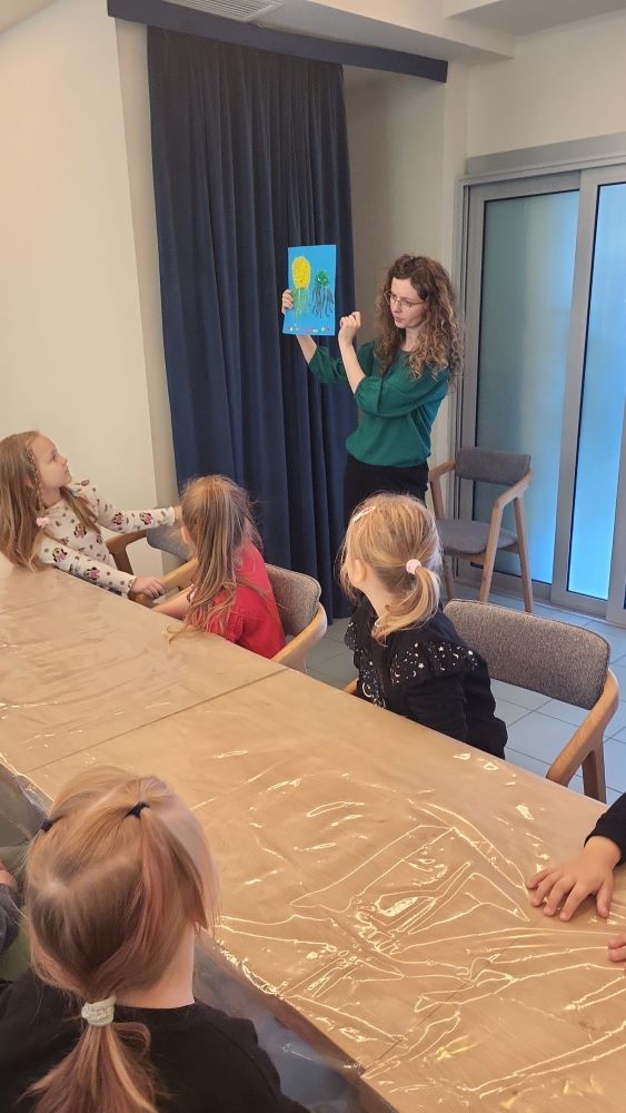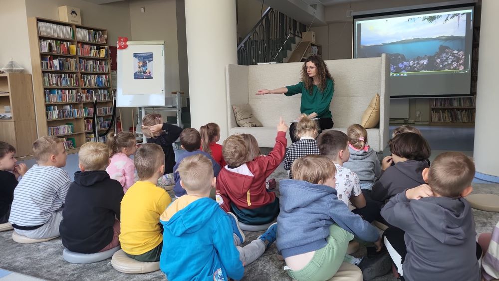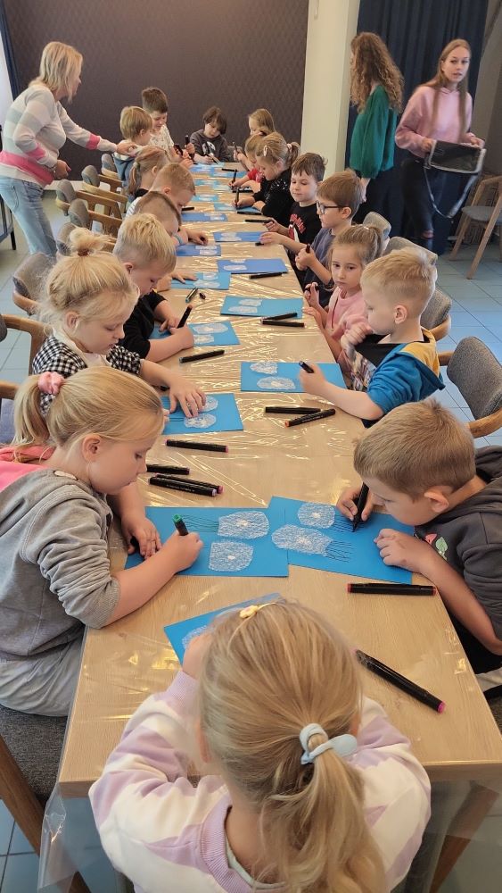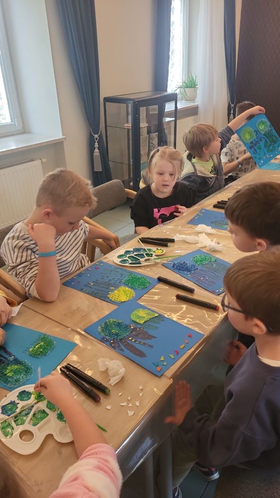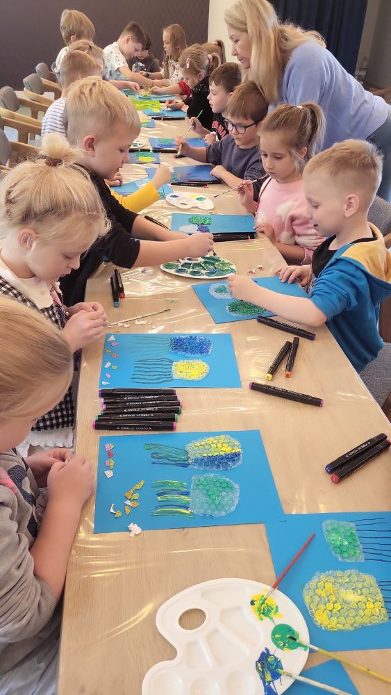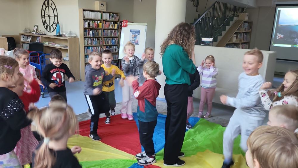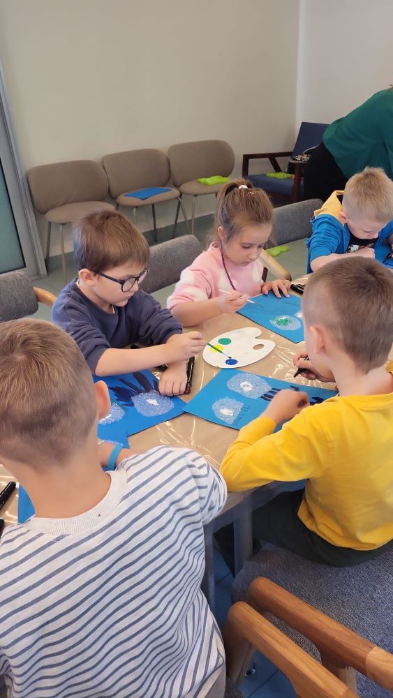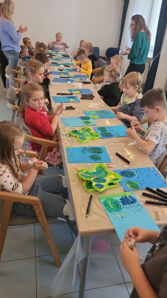 02.10 - Tego dnia wyszliśmy do Biblioteki Publicznej na zajęcia literacko- plastyczne pt. "Ośmiornica na dachu". Dzieci mogły posłuchać bajki i porozmawiać o niej, zobaczyły również film edukacyjny o życiu podwodnym ośmiornicy, bawiły się w zabawy z chustą animacyjną, a na koniec przystąpiły do pracy plastycznej. Po zajęciach odwiedziliśmy plac zabaw na Pl. Hallera.